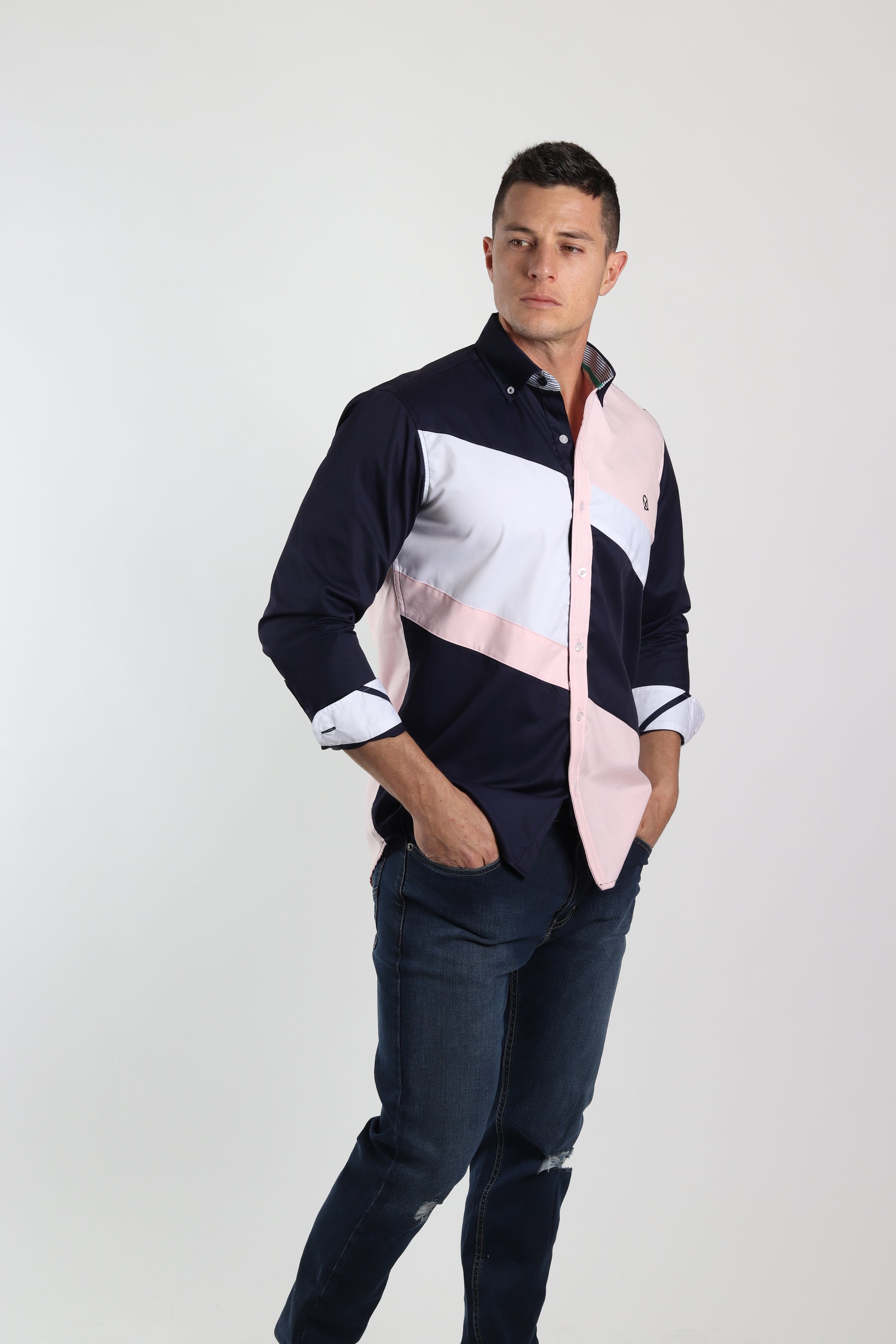 Camisa regular fit en colores combinados. Una prenda cómoda y versátil para lucir con estilo y personalidad. El modelo lleva talla M.