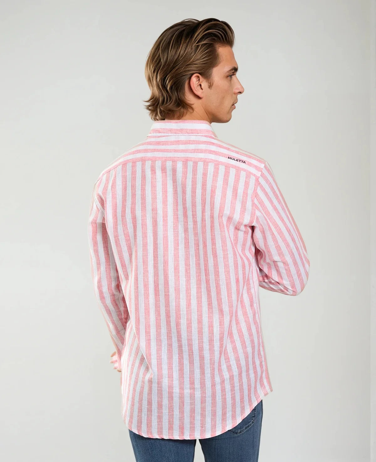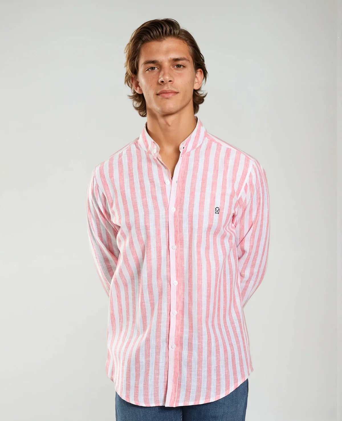 Camisa tipo lino regular fit con cuello mao en color blanco con rayas coral. Una prenda cómoda y ligera, ideal para esta temporada. El modelo lleva talla M.