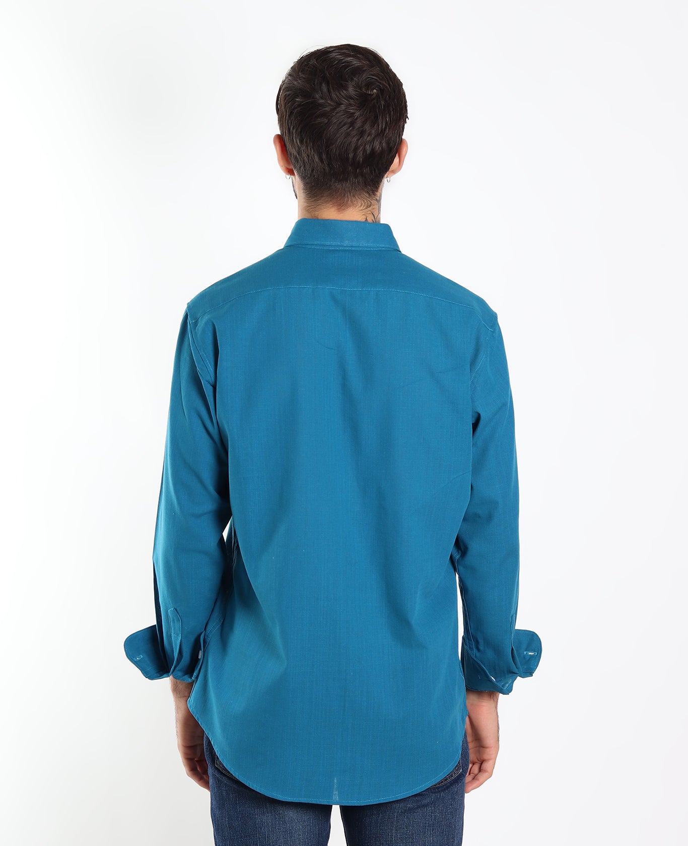 Camisa de lino regular fit en color petroleo. Una prenda cómoda y ligera, ideal para esta temporada. El modelo lleva talla M.