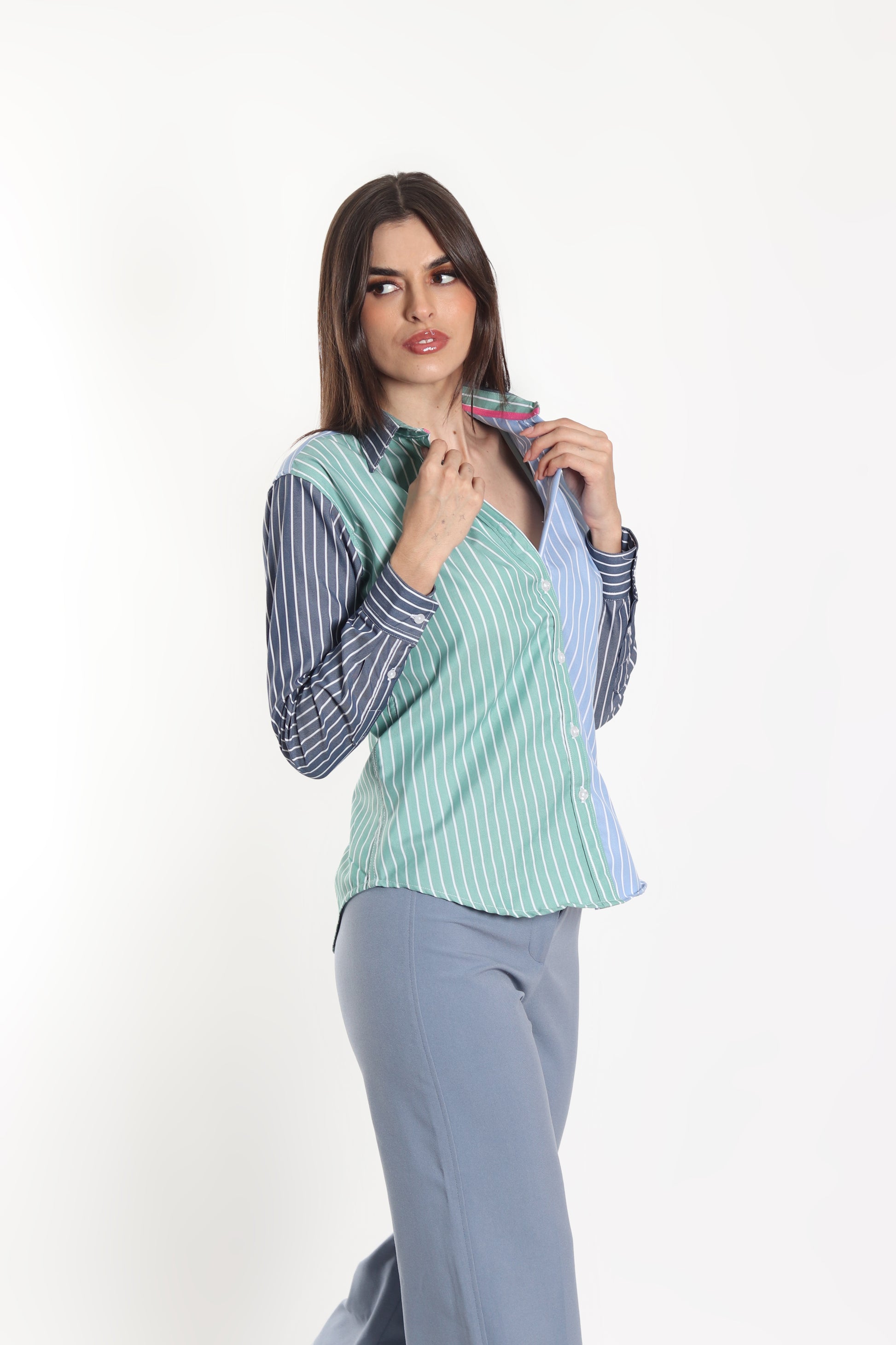 Camisa Muletta regular fit colores en tendencia. Una prenda cómoda y versátil para lucir con estilo en cualquier ocasión. La modelo lleva talla S.