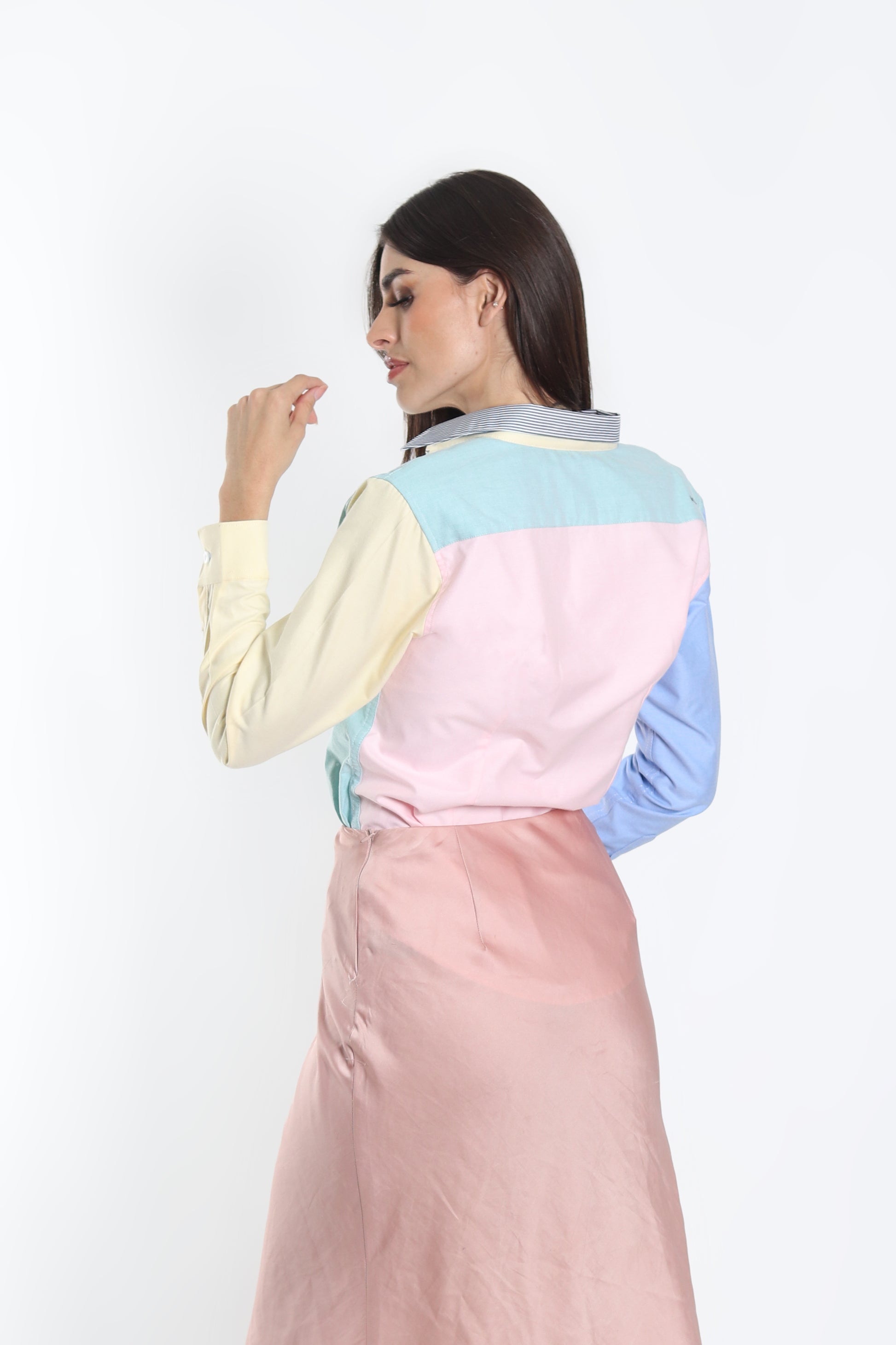 Camisa Muletta regular fit colores en tendencia. Una prenda cómoda y versátil para lucir con estilo en cualquier ocasión. La modelo lleva talla S.
